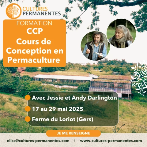Le CCP (Cours de Conception en Permaculture) a lieu du 17 au 29 mai 2025, à la Ferme du Loriot, dans le Gers. La formation allie cours thérique et pratique sur le terrain.