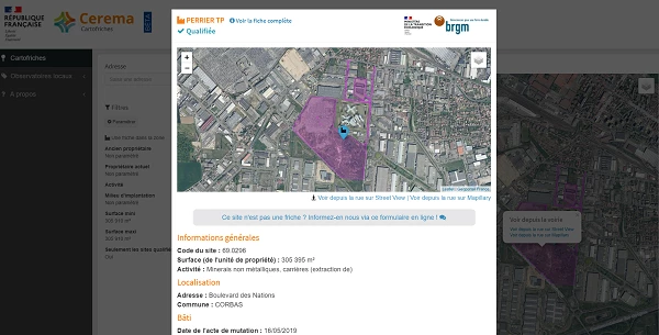 vue d'une fiche sur un site en fricheAfin de limiter l’étalement urbain, une solution est de développer des projets sur d’anciens sites industriels, ou d’autres espaces désaffectés. L’outil Cartofriches, développé par le Cerema pour le Ministère de la transition écologique, permet de visualiser sur une carte ces sites en friche à l’échelle nationale, et constitue un outil pour la prise de décision.