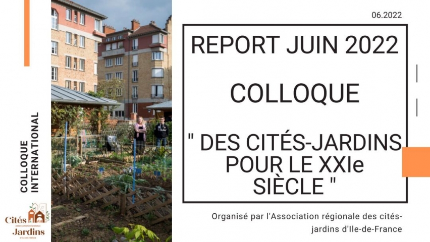 Le colloque “Des cités-jardins pour le XXIème siècle” initialement prévu les 3 et 4 juin 2021, est reporté à la première quinzaine de juin 2022 en raison du contexte sanitaire. Ce report devrait permettre sa tenue en présentiel au Théâtre Jean Vilar de Suresnes.